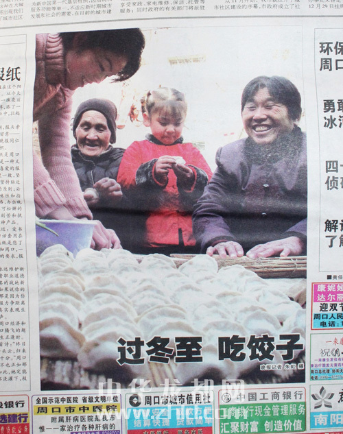 ????創(chuàng)刊號(hào)頭版壓軸圖片《過冬至,吃餃子》,拍攝的是80多歲的姥姥、50多歲的媽媽、30多歲的媳婦、五六歲的小女孩四世同堂歡天喜地包餃子的場景。媳婦搟餃子皮,姥姥、媽媽包餃子,五六歲的小女孩也來湊熱鬧,拿起一個(gè)餃子皮學(xué)著大人的模樣包餃子,剛剛包好的一大鍋蓋餃子令人垂涎。特別是按照晚報(bào)的送報(bào)時(shí)間,創(chuàng)刊號(hào)報(bào)紙送到千家萬戶時(shí)正好是上午11時(shí)之前,此時(shí)正是人們包好餃子準(zhǔn)備煮餃子的時(shí)間??上攵蠹乙贿吰纷x屬于周口人自己的晚報(bào)、欣賞和諧家庭歡天喜地包餃子的圖片,一邊把包好的餃子下到沸騰的開水鍋里,那煮出的餃子香味和著晚報(bào)濃濃的墨香,香飄滿城,沁人心脾。
