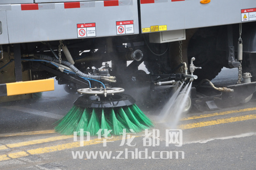 ????當(dāng)天上午,記者在市政府門前看到,由宇通汽車廠家提供試機(jī)的幾臺環(huán)衛(wèi)高壓清洗車和掃地車列成一排(上圖),一臺小型掃地車一邊行駛一邊清掃地面,前端幾個旋轉(zhuǎn)式毛刷(下圖)進(jìn)行清掃的同時,還向地面噴灑出霧狀水,路面上的各類垃圾清掃后吸入后面的車斗里,駛過之處,路面干凈許多。隨后,大型環(huán)衛(wèi)清洗車“上陣”,車體四周分頂噴、中噴和后噴,四五十米寬的道路都能輕松噴射覆蓋。經(jīng)過清水“洗禮”后,兩旁慢車道上綠化帶的植被上積存的浮土被沖刷得一干二凈,綠意顯得更濃了。打開頂噴,清洗車向天空噴射出幾米高的幾股高壓水柱,有效降塵,凈化空氣。經(jīng)過兩輪試驗下來,記者看到,瀝青馬路上變得干凈而清新,以往灰蒙蒙的馬路一下子變得“眉清目秀”。