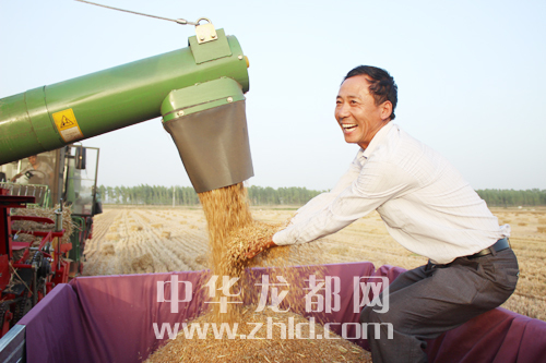 ??? ?眼看金燦燦的麥粒不斷從機倉里流出,項城市一農(nóng)民的臉上露出了燦爛的笑容。為保證夏收順利進行,項城市充分發(fā)揮大型農(nóng)業(yè)機械在麥收中的作用,爭農(nóng)時、搶速度,確保小麥顆粒歸倉。?。◤堄谰?攝)