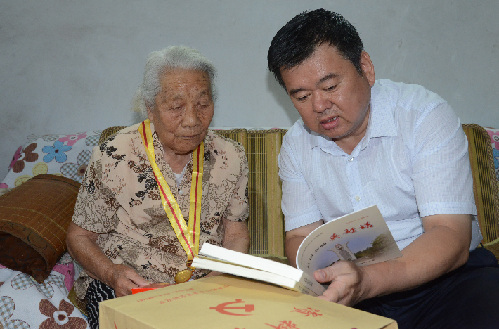 ????徐光一行先后來(lái)到抗戰(zhàn)老戰(zhàn)士老同志郭純義、張明鐸、王琪的家中,親切看望慰問(wèn)他們,把黨和政府對(duì)抗戰(zhàn)老戰(zhàn)士老同志的關(guān)心傳遞到每個(gè)人心中。每到一處,徐光都與他們深入交談,了解他們的生活、起居、身體等情況,與老戰(zhàn)士、老同志一起回憶革命戰(zhàn)爭(zhēng)時(shí)期的崢嶸歲月,共話革命精神的傳承,祝愿他們健康長(zhǎng)壽、生活幸福。慰問(wèn)過(guò)程中,徐光滿懷崇敬之情,為抗戰(zhàn)老戰(zhàn)士老同志們佩戴由中共中央、國(guó)務(wù)院、中央軍委聯(lián)合頒發(fā)的“中國(guó)人民抗日戰(zhàn)爭(zhēng)勝利70周年”紀(jì)念章,送上慰問(wèn)金和黨史書籍。徐光動(dòng)情地說(shuō):“明天就是中國(guó)人民抗日戰(zhàn)爭(zhēng)和世界反法西斯戰(zhàn)爭(zhēng)勝利70周年紀(jì)念日,我代表市委、市政府來(lái)看望問(wèn)候你們,并向你們致以崇高的敬意和良好的祝愿。抗戰(zhàn)年代,廣大老戰(zhàn)士、老同志出生入死、不怕?tīng)奚?、英勇奮斗,為奪取抗戰(zhàn)勝利立下了不朽的功勛,你們是人民的英雄、國(guó)家的功臣,沒(méi)有你們的犧牲奉獻(xiàn),就沒(méi)有我們今天的幸福生活,黨和人民永遠(yuǎn)不會(huì)忘記你們。紀(jì)念抗戰(zhàn)勝利,就是要弘揚(yáng)偉大的抗戰(zhàn)精神,凝聚起實(shí)現(xiàn)周口崛起、富民強(qiáng)市、全面建成小康社會(huì)的強(qiáng)大力量,不斷把周口的各項(xiàng)事業(yè)推向前進(jìn)。”