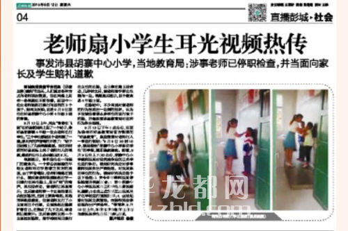 在等待調(diào)查結(jié)果的同時,記者通過網(wǎng)絡(luò)積極尋找與該視頻相關(guān)的信息。9月12日17時許,記者在當天的《彭城晚報》上看到一則標題為《老師扇小學(xué)生耳光視頻熱傳》的消息,報紙上刊登的圖片為視頻中的截圖。據(jù)報道,該事件發(fā)生在江蘇省徐州市沛縣胡寨中心小學(xué)。9月9日7時30許,胡寨中心小學(xué)老師吳某對沒有完成作業(yè)的3名學(xué)生進行體罰,后被人舉報。目前,涉事學(xué)校和老師已向家長和學(xué)生賠禮道歉。