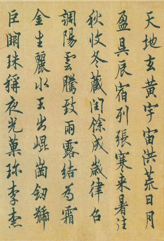 ????《千字文》第一部分從天地開辟講起。有了天地,就有了日月、星辰、云雨、霜霧和四時寒暑的變化;也就有了孕生于大地的金玉、鐵器(劍)、 珍寶、果品、菜蔬,以及江河湖海,飛鳥游魚;天地之間也就出現(xiàn)了人和時代的變遷。在此,《千字文》講述了人類的早期歷史和商湯、周武王時盛世的表現(xiàn),即文中所說的“坐朝問道,垂拱平章。愛育黎首,臣伏戎羌。遐邇一體,率賓歸王。鳴鳳在竹,白駒食場?;徊菽荆嚰叭f方”。