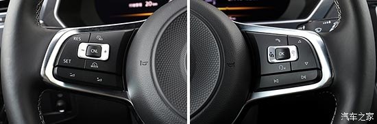 三輻式真皮方向盤造型與國產(chǎn)版本存在一定差異,中間部分采用圓形設計,且邊緣鑲嵌帶有R-Line標識的銀色飾條,視覺效果更加動感、精致。方向盤圈輻偏細,好在真皮材質(zhì)較為細膩,握感更趨向舒適,而下方采用平底造型,能夠為駕駛員營造更充足的腿部空間。除了常見的音量調(diào)節(jié)和行車電腦切換等功能外,背面還帶有換擋撥片,“不幸”的是,Tiguan的變速箱天資聰慧,用到它的幾率比較有限。