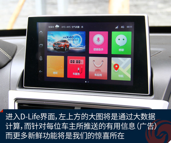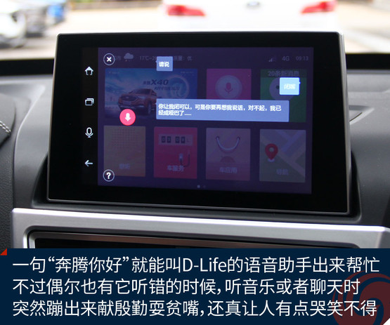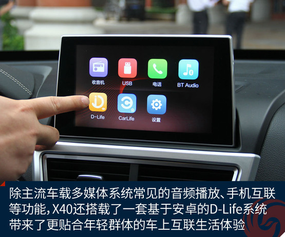 不過跟奔騰X40接觸兩天之后,會發(fā)現(xiàn)它大可不必在對手林立的市場中血拼顏值,靠實力不俗的獨門絕技一樣能夠輕松獲得一席之地。既然面向年輕用戶,豐富的車載娛樂系統(tǒng)很關鍵。大屏幕、手機互聯(lián)等等似乎已經(jīng)是這類車的標配。奔騰X40更進一步,所搭載的D-Life系統(tǒng)讓我們看到了它引領潮流的勁頭。