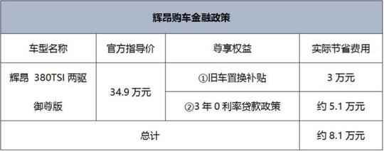 ????????目前購(gòu)買輝昂,可享受首付30%,三年零利率的金融政策,同時(shí)還可以享受3萬元置換補(bǔ)貼或者1萬元保險(xiǎn)補(bǔ)貼,詳情請(qǐng)見下表: