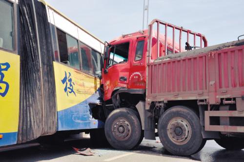 ????????記者觀察到,大客車側(cè)面寫有“交通駕校”一行大字,車頭朝西車尾朝東停著,右側(cè)車身被橋墩緊緊卡??;運(yùn)水罐車長(zhǎng)近20米,車身與大客車車身幾乎呈90度直角,運(yùn)水罐車車頭撞在大客車的左后側(cè),將大客車撞癟了。事發(fā)地點(diǎn)位于橋坡處,地面遍布七零八落的玻璃碎片,運(yùn)水罐車下面還有少量血跡。運(yùn)水罐車和大客車內(nèi)均空無(wú)一人。