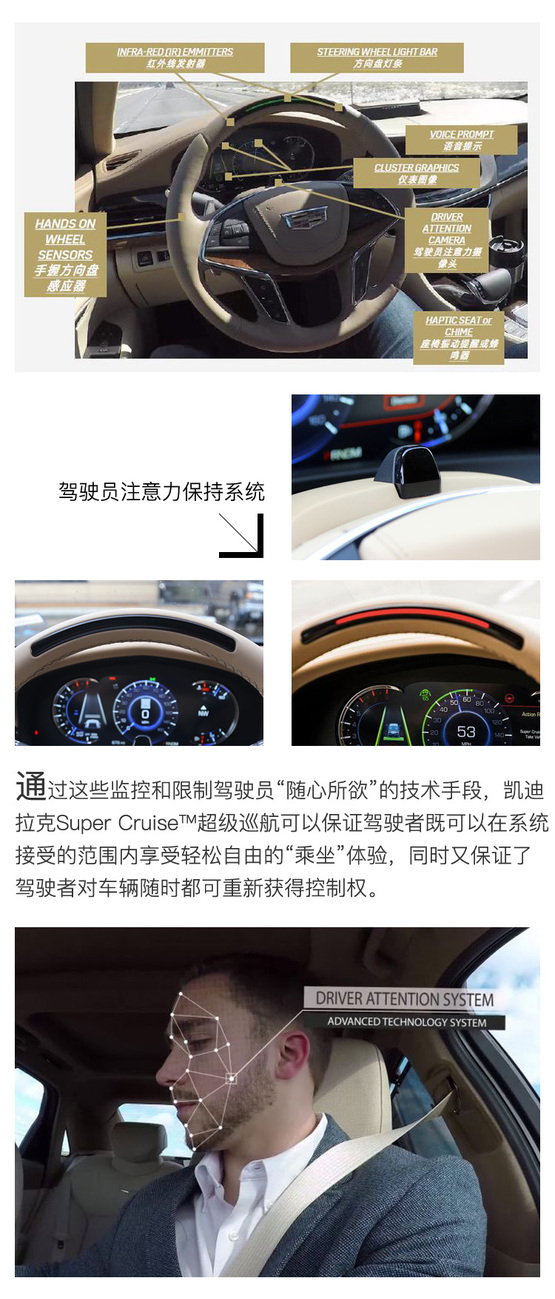 ????????小結(jié):?Super Cruise?超級(jí)巡航系統(tǒng)利用大量創(chuàng)新科技最大程度的規(guī)避了“自動(dòng)駕駛”可能出現(xiàn)的潛在危險(xiǎn),用“監(jiān)督”駕駛者的方式化解了駕駛員對(duì)“自動(dòng)駕駛”的疑慮。相比其它Level2級(jí)別的駕駛輔助系統(tǒng),超級(jí)巡航的理念顯然更適合當(dāng)前人與車與交通環(huán)境的交流運(yùn)作方式。有專家說過整個(gè)“自動(dòng)駕駛”大環(huán)境里最不穩(wěn)定的因素就是人,因?yàn)槿藳]辦法和“人性”做抗?fàn)?。這么看來凱迪拉克Super Cruise?超級(jí)巡航有點(diǎn)像中學(xué)時(shí)整天趴在教室后門窗戶上“監(jiān)視”我們的班主任老師,他管著你,是為了你好。