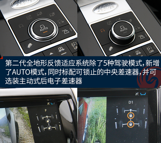 這套第二代全地形反饋適應系統(tǒng),提供五種駕駛模式:普通駕駛模式、雪地模式、泥地模式、沙地模式以及攀巖模式。這些放在全新一代發(fā)現(xiàn)上似乎不值一提,不過第二代系統(tǒng)加入了AUTO模式,可自動監(jiān)測行車狀況。同時,第二代系統(tǒng)標配可鎖止的中央差速器,并可選裝主動式后電子差速器。