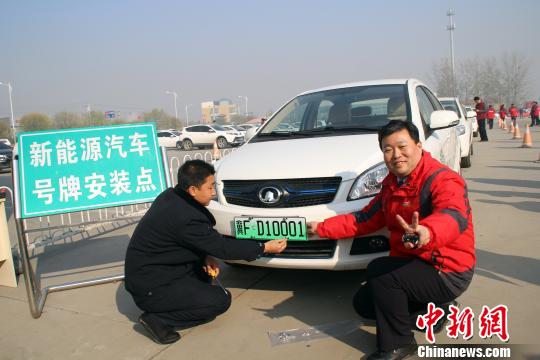 ????保定市民康辰龍領(lǐng)到該市第一副新能源汽車專用號牌。 于俊亮 攝