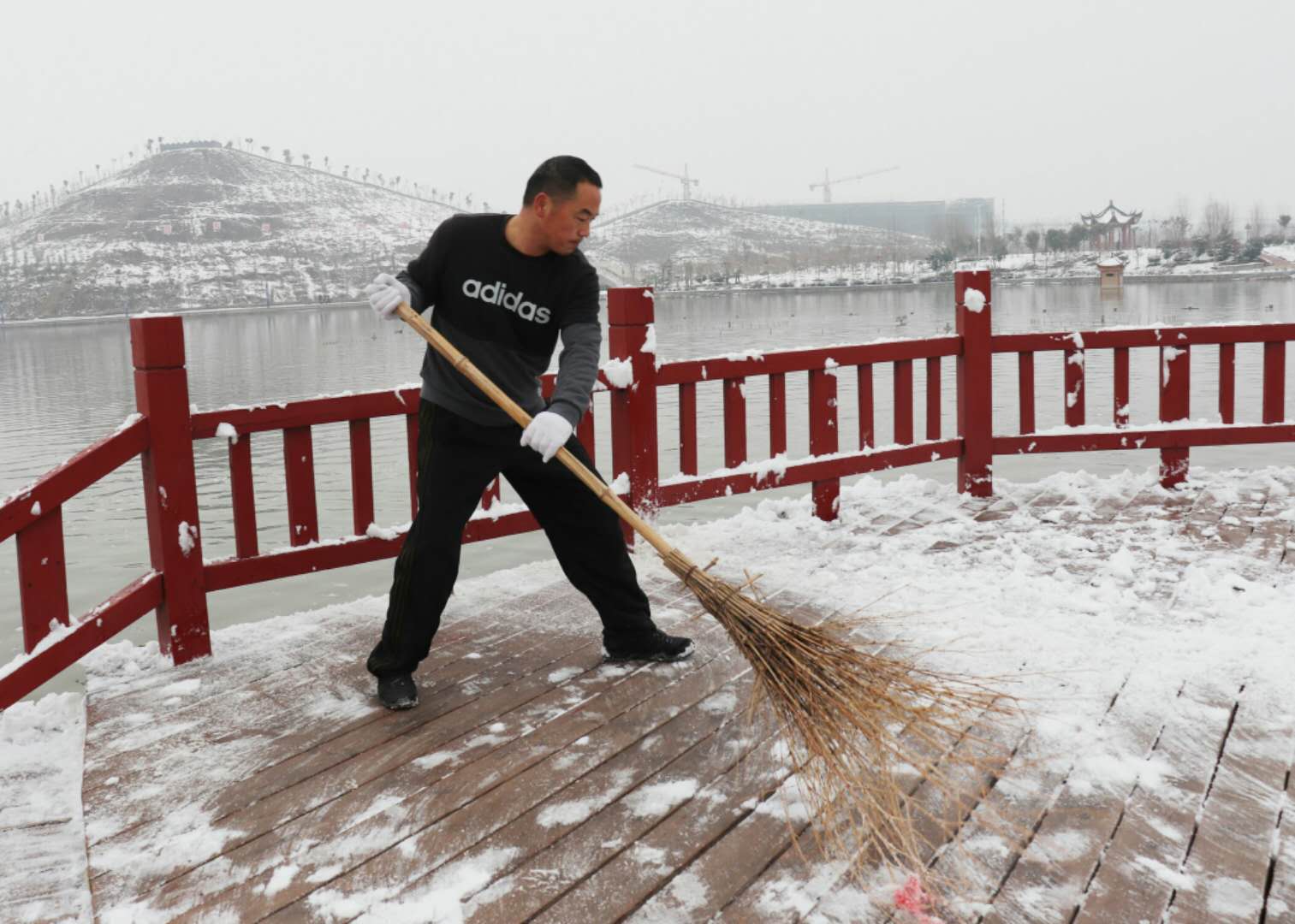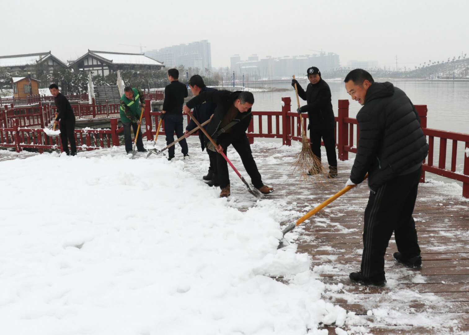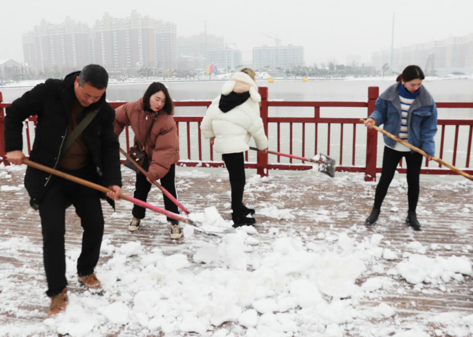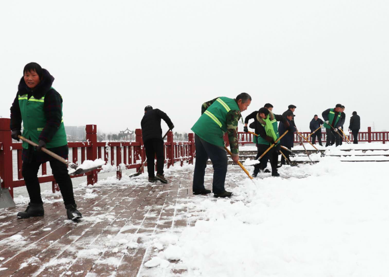 經(jīng)過(guò)兩場(chǎng)大雪的洗禮,空氣格外清新,但鹿邑上清湖公園內(nèi)積雪嚴(yán)重,且已結(jié)冰,給市民游園帶來(lái)了諸多不便和隱患。從早晨到下午4點(diǎn)半,鹿邑市政園林中心的干部職工和道德公益志愿者在上清湖集合后,投入鏟雪掃雪行動(dòng),經(jīng)過(guò)一天的緊張清掃,上清湖湖面棧道和園內(nèi)公路上的積雪清掃一遍。道德公益志愿者鐘華在微信群里提出建議后,有十幾位志愿者報(bào)名參加上清湖義務(wù)掃雪活動(dòng)。