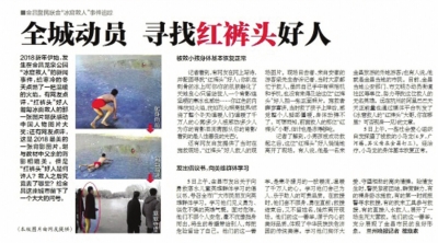 1月3日,中央電視臺(tái)新聞?lì)l道《新聞直播間》欄目報(bào)道此事。一時(shí)間,“紅褲頭”救人的事跡,在金昌市乃至整個(gè)甘肅省引起了強(qiáng)烈的反響。在官方微信平臺(tái)上,有上百條留言,大多是為“紅褲頭”小哥點(diǎn)贊的。不少人希望找到這個(gè)不愿留名的英雄。為此,《金昌日?qǐng)?bào)》以及當(dāng)?shù)孛襟w紛紛發(fā)起“尋找紅褲頭好人”“尋找冰窟救人的無名英雄”的尋人啟事。