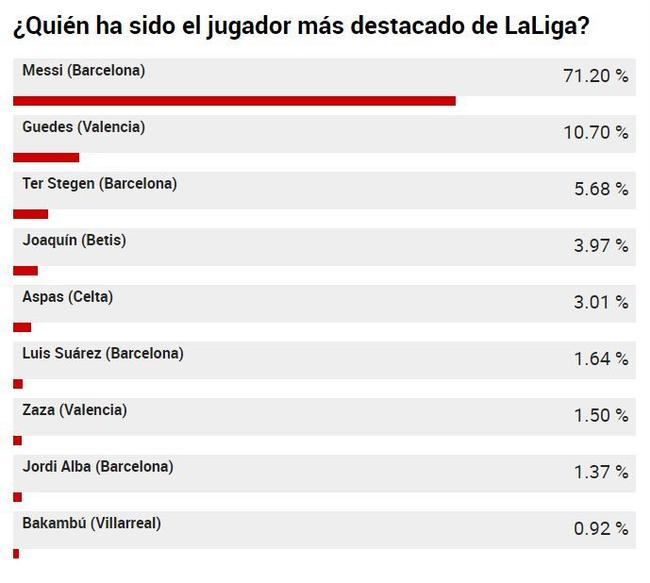 對于西甲半程最佳球員的投票,有高達(dá)71.2%的球迷將票投給了梅