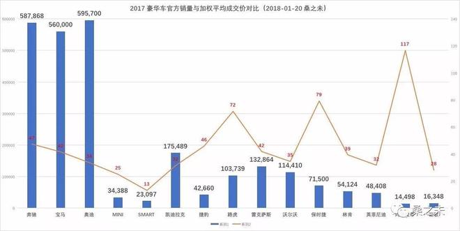銷售的數(shù)量固然重要,但是銷售質量也是評估銷售力不能忽視的重要指標。衡量銷售質量,“加權平均成交價”和“單車利潤”這兩個重要參數(shù),也許讓我們更直觀的看到車企的銷售能力與經(jīng)銷商單店經(jīng)營質量。這些更微觀的數(shù)據(jù)往往更能反映銷售公司及其經(jīng)銷商體系的銷售能力及水平?!凹訖嗥骄山粌r”反映車企的產(chǎn)品力與銷售公司的銷售能力,車企賣掉的車越多,單車價格越貴,品牌就越具有競爭力,反之就需要考慮改進產(chǎn)品,提升銷售管理能力?!皢诬嚴麧櫋敝附?jīng)銷商銷售新車獲取的利潤,不含衍生利潤,一般在-4%-7%之間,如果單車利潤超過-2%,廠家需要考慮對經(jīng)銷商進行補貼,如果利潤超過7%,車企就會調整經(jīng)銷商浮動返利。下面我們通過這兩個指標,來看哪些豪華車品牌在2017年表現(xiàn)更具實力。
