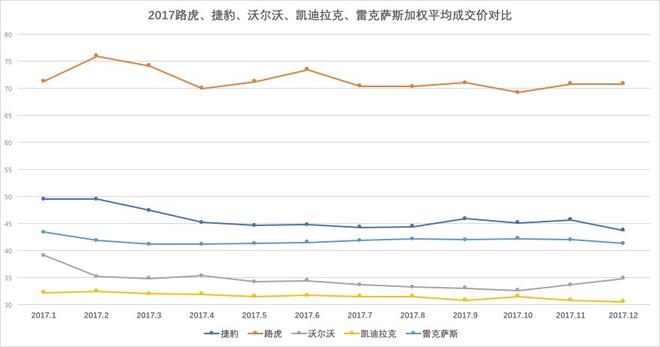 凱迪拉克、捷豹路虎、雷克薩斯、沃爾沃四個品牌銷量在10萬輛以上為第二陣營。除路虎外,捷豹因進口F-pace帶動其成交價上揚,隨著XE國產(chǎn)上市銷售,捷豹銷量有望進一步增長,價格進一步下探;以銷售進口車型為主的雷克薩斯,今年銷量質量不錯,庫存時間短,資金周轉快,多數(shù)以訂單方式銷售,加權平均價在42萬上下,成交價格走勢平穩(wěn),經(jīng)銷商今年利潤也很豐厚。沃爾沃在新款車型的帶動下,成交價格開始上揚;凱迪拉克今年銷量增速較快,通過下圖我們可以看到,凱迪拉克基本依靠低價獲取銷量的增長,成交價格進一步走低,經(jīng)銷商的利潤需要依靠廠家補貼。