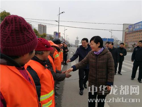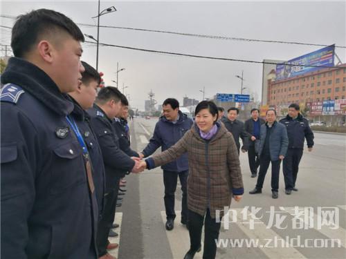 在鄲城縣城新華路與迎賓大道路口,羅文閣、李全林和一線值勤的環(huán)衛(wèi)工人、城管隊員一一握手,深切關心環(huán)衛(wèi)工人和城管隊員的冷暖?!翱词侄鄾觯┖顸c兒呀。大年三十了,你們放棄和家人團圓吃餃子的機會,在為我們的縣城保潔,我們城市的清潔有賴于你們。你們辛苦了,給你們拜個年,祝你們身體健康?!绷_文閣向環(huán)衛(wèi)工人遞上慰問金時,樸實的話語、殷殷的關懷把黨的溫暖涌向環(huán)衛(wèi)工人的心窩兒?!安恍量啵I導來看俺,俺里比吃餃子暖和?!杯h(huán)衛(wèi)工人邊鼓掌邊道出了內(nèi)心的激動。