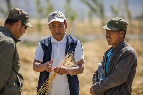 2017年9月是新疆哈密的小麥?zhǔn)崭罴?,全國人大代表、治土人黨永富在田間考察化肥減量、農(nóng)業(yè)提質(zhì)的實際效果。