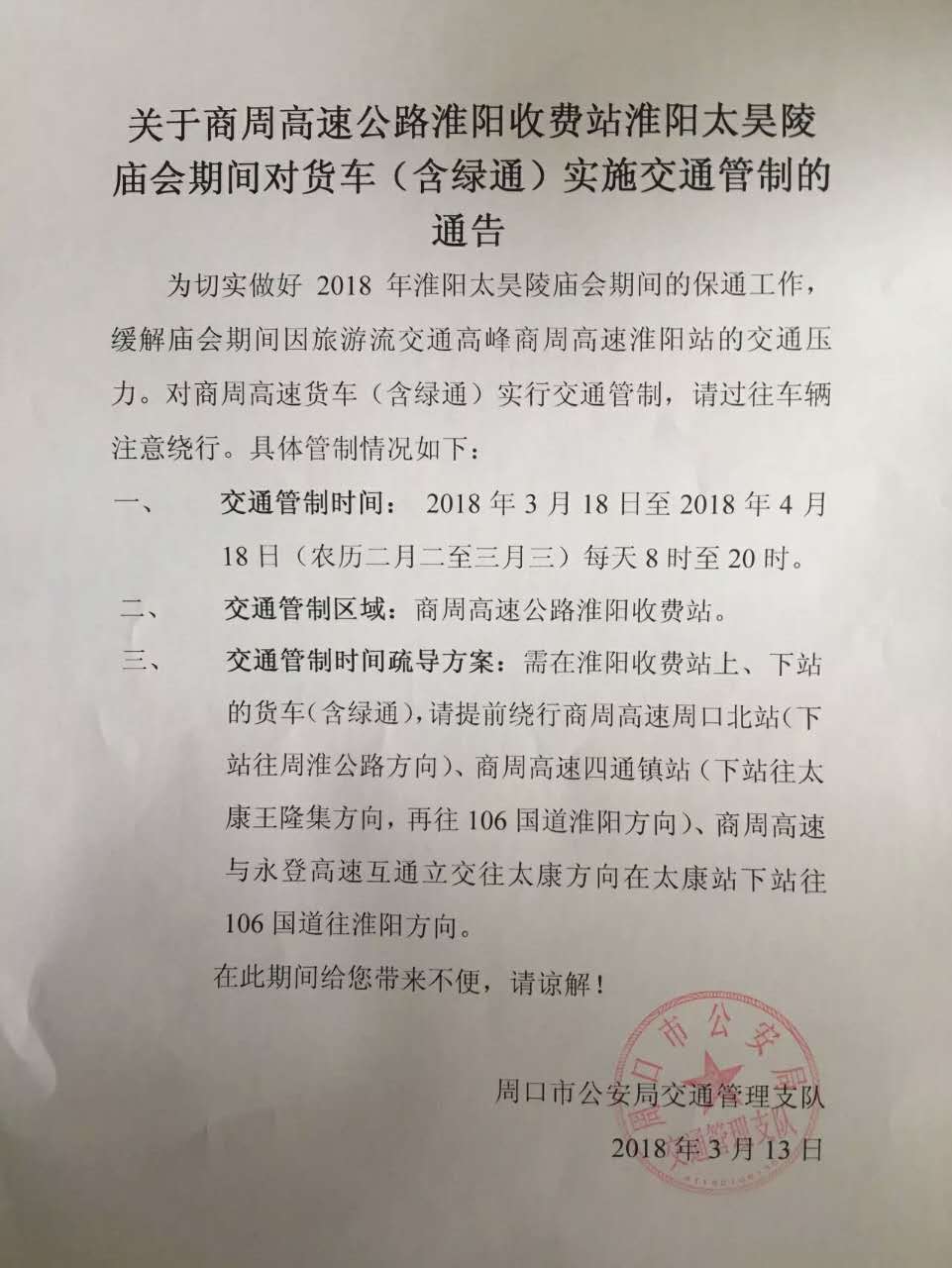 三、交通管制期間疏導(dǎo)方案:需在淮陽(yáng)收費(fèi)站上、下站的貨車(chē)(含綠通),請(qǐng)?zhí)崆袄@行商周高速周口北站(下站往周淮公路方向)、商周高速四通鎮(zhèn)站(下站往太康王隆集方向,再往106國(guó)道淮陽(yáng)方向)、商周高速與永登高速互通立交往太康方向在太康站下站往106國(guó)道往淮陽(yáng)方向。