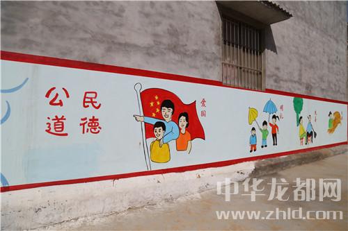 當(dāng)日16時許,記者在該村看到,干凈整潔的水泥路像玉帶在村中盤旋,街道兩側(cè)栽植不久的小樹在向人們招手,坑塘四周干凈整潔,綠樹環(huán)繞,塘水清澈,梳理有致,房前屋后干凈整潔……天空中雖然下著雨,但是記者遠(yuǎn)遠(yuǎn)的就聽到了群眾的談笑聲和機械的轟鳴聲,走近,原來是村民們不顧天氣下雨,依然在自發(fā)地進行道路清理工作。記者看到,該村墻體文化更讓村子增加了很多的“內(nèi)涵”。