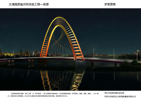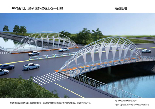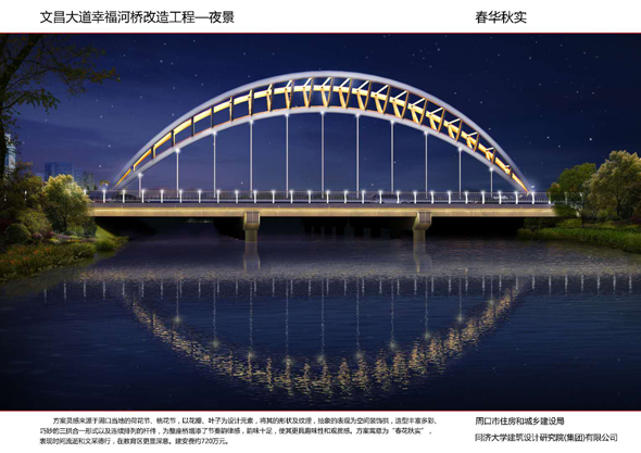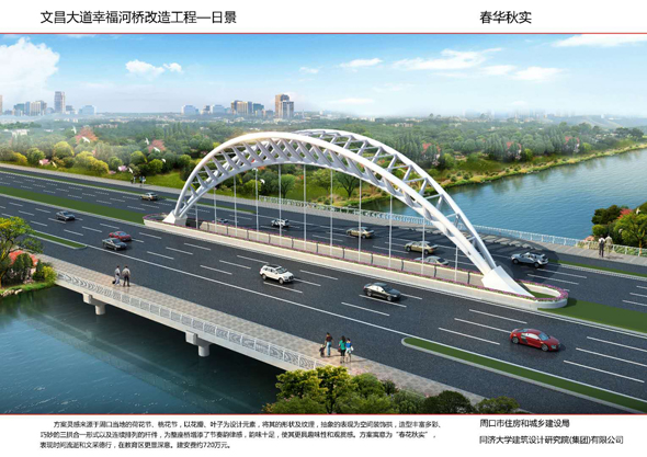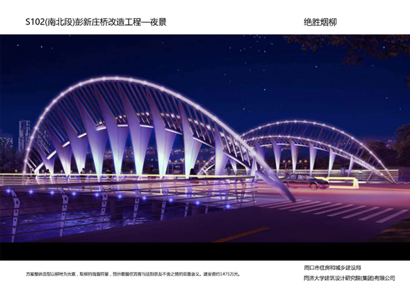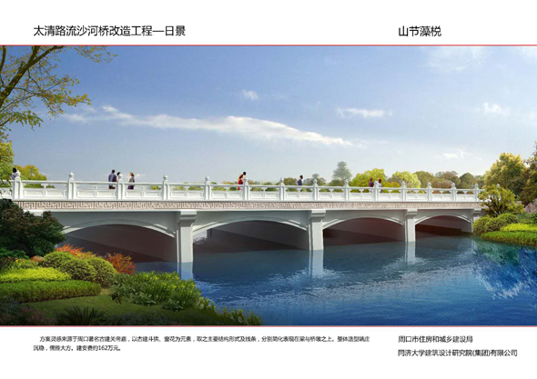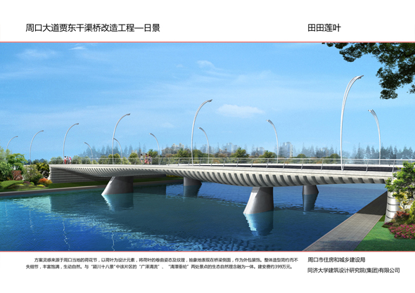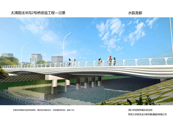 周口大道沙潁河橋景觀改造,設(shè)計造型簡單柔美,如行云流水,同時與沙潁河景觀帶相融合,給城市增添了生機與活力。周口大道賈東干渠橋以荷葉為設(shè)計元素,造型簡約而不失細節(jié)。周口大道流沙河橋造型簡潔大氣,線條流暢,像一條青龍游弋在水面上。文昌大道幸福河橋以花瓣、葉子為設(shè)計元素,造型豐富多彩。文昌大道流沙河故道橋在中分帶位置修建花壇,花壇造型莊重古樸,景石造型端莊沉穩(wěn)。太清路流沙河橋以古建斗拱、窗花為元素,造型儒雅大方。太清路洼沖溝2號橋以“輻轂相依”為名,既融合環(huán)境,又有團結(jié)、合作的寓意。太清路賈魯河橋,增加了景觀造型,使人們可以重溫當(dāng)年賈魯河的美好畫卷。彭新莊橋以柳葉為元素,預(yù)示著留住賓客與送別親友的不舍之情的雙重含義。