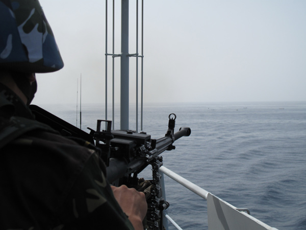 “噠噠噠……”,特戰(zhàn)隊員扣動扳機,重機槍發(fā)出猛烈的怒吼,呼嘯而出的子彈在海盜快艇前筑起一道難以逾越的火線,海盜見狀,頓時慌了手腳,急忙調轉船頭,倉皇逃竄。