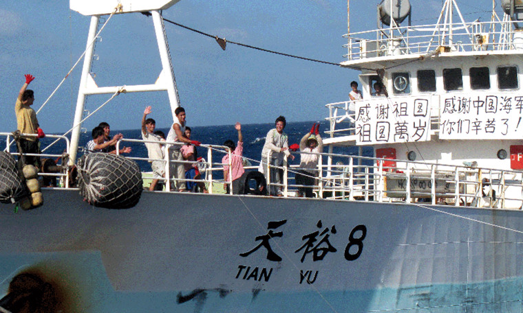 2009年2月8日下午,飽經(jīng)風雨、銹跡斑斑的“天裕8號”進入視野,航行在海口艦右前方,搖曳在風浪中,猶如一個失散多年的孩子。