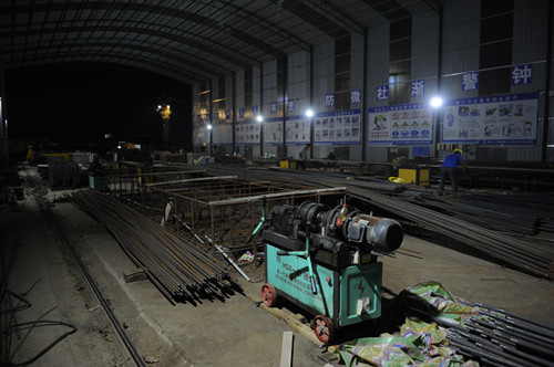當(dāng)晚21時許,記者在泰和家園施工現(xiàn)場看到,鋼筋加工棚的工人們正在進行鋼筋的切割,他們在為明天施工準(zhǔn)備鋼筋材料。A1#樓正在進行墊層的澆筑工作,A8#樓正在進行負一層及周邊地庫的鋼筋綁扎及模板加固工作,A9#樓正在進行負一層墻柱鋼筋及模板內(nèi)架搭設(shè)工作。現(xiàn)場2臺鋼筋切割機在不停地運轉(zhuǎn),9臺塔吊在持續(xù)工作,40余名施工人員在場地內(nèi)各司其職,緊張而有序地趕進度,整個施工現(xiàn)場如火如荼。