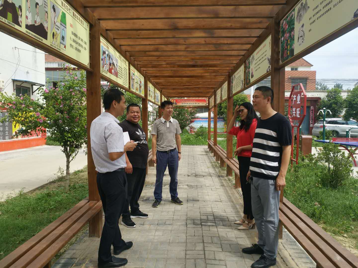 一條干凈的水泥路從村子中間橫穿而過,路兩側(cè)和村民房前屋后的大葉女貞流綠滴翠,木槿花開正盛,花朵壓彎了枝條,一面面文明禮讓、孝親敬老、鄰里和睦、移風(fēng)易俗、反腐倡廉的文化墻,畫面生動(dòng)、形象,讓人忍不著駐足觀看,社會(huì)主義核心價(jià)值觀宣傳處處可見。