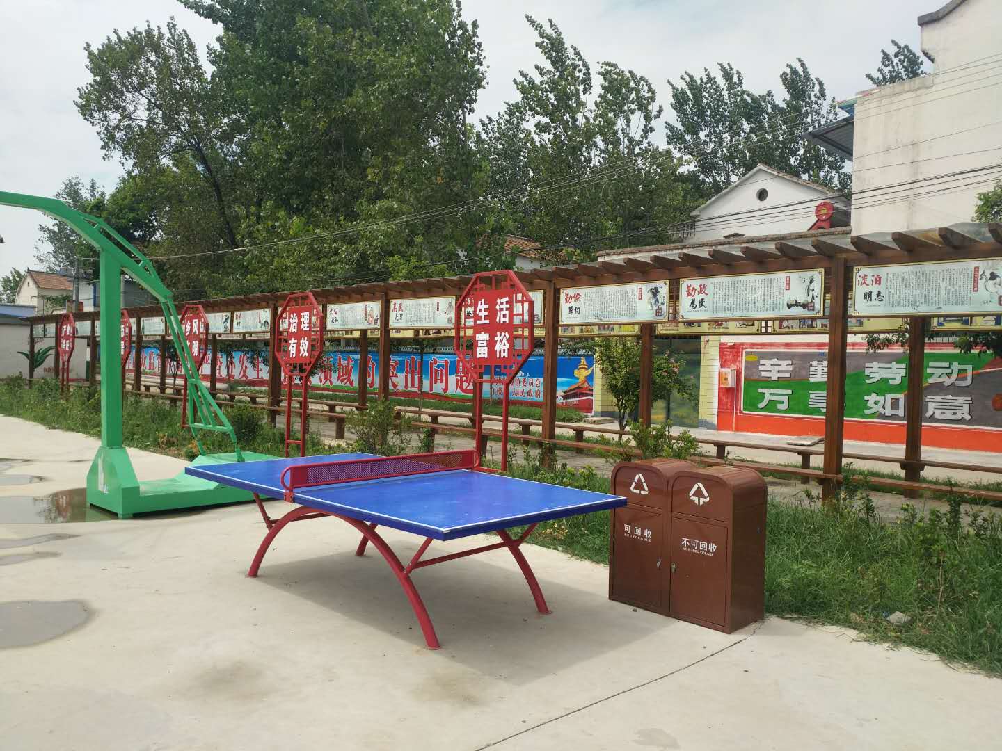 在近2000平方米的文化廣場(chǎng)上,南側(cè)聳立著高高的旗桿,上方五星紅旗迎風(fēng)飄揚(yáng);北側(cè)一字排開牽引器、漫步機(jī)、 健騎機(jī)、扭腰器等健身器材,五六位鶴發(fā)童顏的老年人正樂呵呵地鍛煉;東側(cè)設(shè)立的籃球架、乒乓球臺(tái)正等待放學(xué)的孩子前來玩耍;西側(cè)新設(shè)的木排廊成了村民休閑聊天的好去處。村黨支部書記郝道杰稱,前一段,有村民提出,健身后累了缺少休息的地方。在征求群眾意見的基礎(chǔ)上,他們?cè)O(shè)置了這個(gè)木質(zhì)排廊。