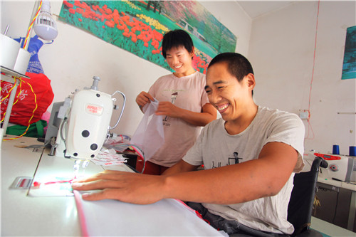 生意閑的時候,朱建舟又和妻子商量,借錢購買了兩臺縫紉機(jī),幫助附近一家工廠加工環(huán)保袋。加工活雖然不累,但對于雙腿殘疾的朱建舟來說卻很困難。一向愛動腦筋的朱建舟自己動手把縫紉機(jī)踏板改裝成手動式的,大大提高了工作效率?!耙粋€月能掙2000多元錢,還能顧家,照顧病人和孩子?!蓖跷迥菪睦镉姓f不出的高興。