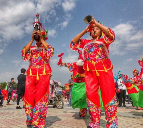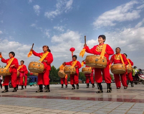 廣場上,一排排碩大的紅氫氣球高懸,氣球下縣掛著祝賀農民豐收節(jié)的標語。穿著各種鮮艷顏色的表演服裝的民間藝術表演隊,給節(jié)日增光添彩,擂響盤鼓,為節(jié)日助威。從全縣23個鄉(xiāng)鎮(zhèn)起早趕來的46支民間藝術表演隊伍,伴隨著悠揚的音樂,喧天的鑼鼓在廣場上各顯其能。腰鼓、盤鼓、耍獅子、劃旱船、抬花轎、挑花籃、廣場舞也以不同的方式表達著豐收的喜悅。