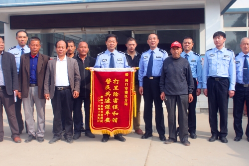 10月9日上午,李埠口鄉(xiāng)孫莊村數(shù)十名群眾代表,來到周口市公安局港區(qū)分局,將寫有“打黑除害促和諧,警民共建保平安”的錦旗和感謝信送到何學(xué)民政委的手中,村民代表對分局鐵腕鏟除該村“村霸”維護孫莊村和諧穩(wěn)定表示由衷的感謝。
