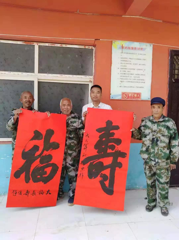 鄲城縣衛(wèi)計(jì)委駐虎崗鄉(xiāng)虎崗行政村第一書記王忠樸,是鄲城縣書法協(xié)會(huì)副主席兼秘書長(zhǎng),在他的牽線下,鄲城縣書法協(xié)會(huì)主席巴云山帶領(lǐng)10多名書法協(xié)會(huì)會(huì)員前來助陣,與敬老院里懂書法的老人一起揮毫潑墨。