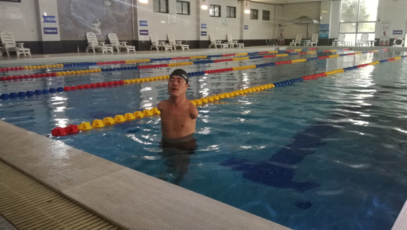 本報訊 10月16日上午,市體育中心游泳館一訓練池內,一名運動員正用不同尋常的泳姿在賽道內訓練。只見他雙腳奮力踏水,努力保持身體平衡,到達終點時,這名運動員不是用手觸壁,而是用頭部觸壁。當他站起身時,人們才發(fā)現(xiàn)他是一名失去雙臂的殘疾運動員。他就是我市備戰(zhàn)省第七屆殘運會的運動員島建書。