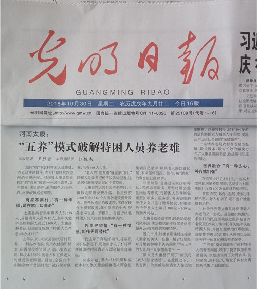 為助力脫貧攻堅,有效提高農(nóng)村特困老人整體供養(yǎng)水平,太康縣民政局、縣扶貧辦等部門在縣委、縣政府正確領(lǐng)導下,按照“一戶一策、一人一法”原則,創(chuàng)新實施集中供養(yǎng)、親情贍養(yǎng)、社會托養(yǎng)、居村聯(lián)養(yǎng)、鄰里助養(yǎng)“五養(yǎng)”模式,有效破解了特困老人的脫貧和養(yǎng)老難題。該做法經(jīng)《周口日報》率先報道后,國家級、省級媒體紛紛慕名前往太康采訪。截至目前,百余家媒體或網(wǎng)站相繼報道了太康“五養(yǎng)”模式。10月30日,《人民日報》《光明日報》分別以《養(yǎng)老,河南太康有了一攬子方案》《河南太康:“五養(yǎng)”模式破解特困人員養(yǎng)老難題》為題重磅介紹了太康“五養(yǎng)”模式經(jīng)驗。10月30日,人民日報海外版官方網(wǎng)站還以《河南太康:“五養(yǎng)”模式來了 特困人員笑了》為題作了報道。據(jù)了解,國家級3家主流媒體同一天內(nèi)報道同一工作經(jīng)驗,在太康縣宣傳史上尚屬首次。