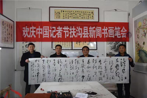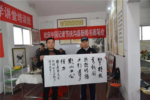 筆墨寫春秋,重彩頌佳節(jié)。為慶祝第19個(gè)中國(guó)記者節(jié),在扶溝縣的張坡詩(shī)詞名人書畫館,來(lái)自省書法家協(xié)會(huì)的書法家與當(dāng)?shù)匦侣勑麄鞑块T的書畫愛(ài)好者們齊聚一堂,以舉行書畫筆會(huì)的形式向新聞媒體人慶賀節(jié)日。
