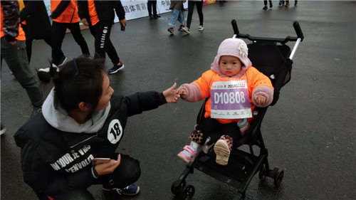 “重在參與,讓寶寶也感受一下馬拉松的比賽的氣氛,目的還是帶孩子活動活動,從小養(yǎng)成一個運動的好習(xí)慣?!币σ壮康膵寢屵@樣介紹。