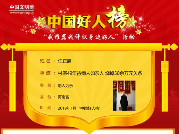 太康縣馬頭鎮(zhèn)任莊村村醫(yī)任正啟,待病人如親人,用腳步丈量任莊村周邊的每寸土地,他49年燒掉50余萬(wàn)元貧困戶看病欠條。2月25日,中國(guó)文明網(wǎng)發(fā)布消息:任正啟榮登2019年1月“助人為樂(lè)類”“中國(guó)好人榜”。