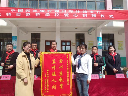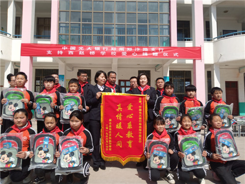 捐贈儀式上,鄭汴路支行行長苗長海一行向趙橋學校捐贈文具袋50只、書包50個、跳繩50根、板球拍50對、熱水袋50只、圍巾50只、跳棋50盒、沙包200個。苗長海表示,光大銀行鄭州鄭汴路支行會一如既往的積極響應黨中央脫貧攻堅的重大部署,與省、市、縣、鄉(xiāng)結合繼續(xù)開展形式多樣的愛心扶貧等公益活動。他希望趙橋學校要運用好捐贈的學習、生活、體育用品,同時勉勵孩子們一定要好好學習、將來回報社會各界的關愛和支持。