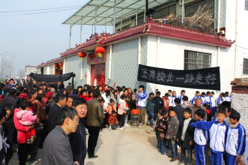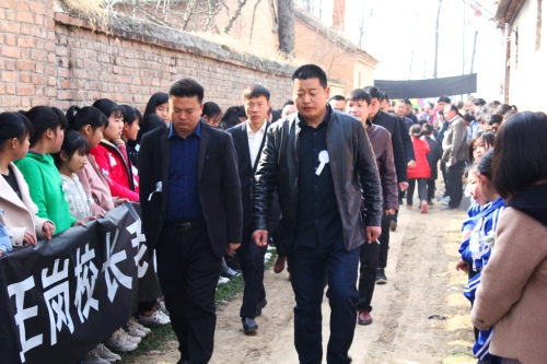 院內(nèi)正廳上方,懸掛著黑底白字的橫幅“沉痛悼念王崗?fù)尽?,院外道路兩?cè),擺滿了人們敬獻的黑紗、花圈。市教體局領(lǐng)導(dǎo)來了,縣政府副縣長肖煒來了,縣教體局局長劉現(xiàn)營來了;局黨組成員、各鄉(xiāng)校校長來了,王崗最愛的學生、同事來了;學生家長也來了……大家胸佩白花,向這位愛崗敬業(yè)的基層校長表示崇高的敬意和深切的哀悼。