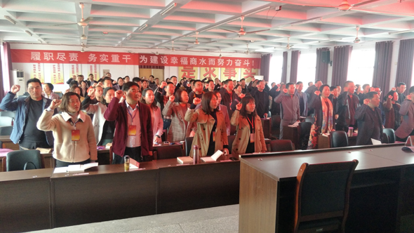 開班之前,縣領(lǐng)導(dǎo)和全體學(xué)員舉起右手、握緊拳頭,在鮮紅的黨旗下,重溫了入黨誓詞。
