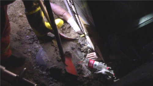 指揮員在與司機溝通時發(fā)現(xiàn),由于車身很重,司機手臂很快出現(xiàn)血液流通不暢、知覺微弱現(xiàn)象,如不及時脫困,后果十分嚴(yán)重。情況緊急,救援人員先利用剪擴(kuò)器對駕駛室與被困人員手臂處進(jìn)行擴(kuò)張,但由于車身較重,地面所墊硬物無法承受壓力,擴(kuò)張器無法發(fā)揮作用。隨后,救援人員利用鐵鍬在被困人員手臂下進(jìn)行挖土,5分鐘后,隨著空間的逐漸擴(kuò)大,被困人員手臂被小心翼翼抽回,司機成功脫困,消防指戰(zhàn)員從駕駛證另一側(cè)把他救出。