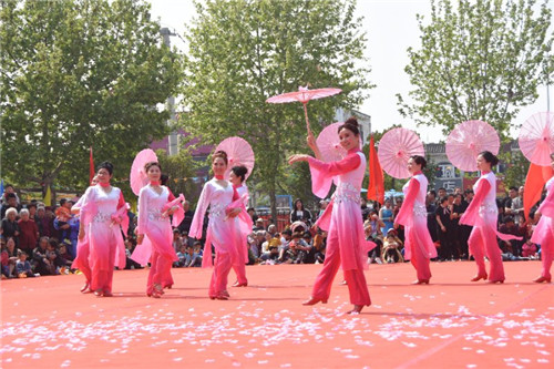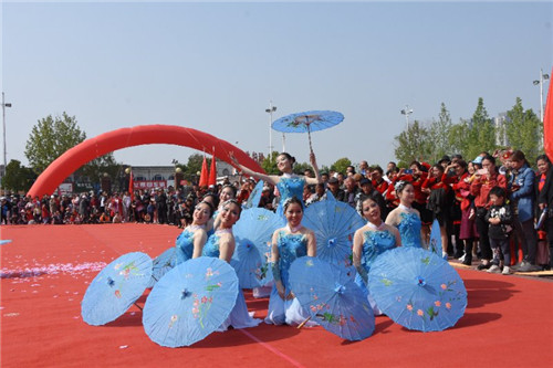 比賽進行到將近一半時候,縣第二實驗小學參賽隊帶來的舞蹈《麗人行韻》將大賽推向了高潮。表演開始,身著天藍漸變色長裙的38名姑娘手持彩傘一字列隊緩步入場,正當觀眾們看得入神時,她們突然將彩傘都齊刷刷地舉過頭頂并瞬間打開,無數(shù)粉紅色的花瓣從彩傘中紛紛飄落,像從碧藍的天空中下起了無盡的花瓣雨。選手們短短幾秒鐘的舉動,在廣場上勾勒出了一個人間仙境,引人入勝。在粉紅花瓣的映襯中,傘下腳步輕盈的女子們微微舞動,美若天仙,婀娜多姿,展現(xiàn)了“人面桃花相映紅,桃花依舊笑春風”的作品主題。