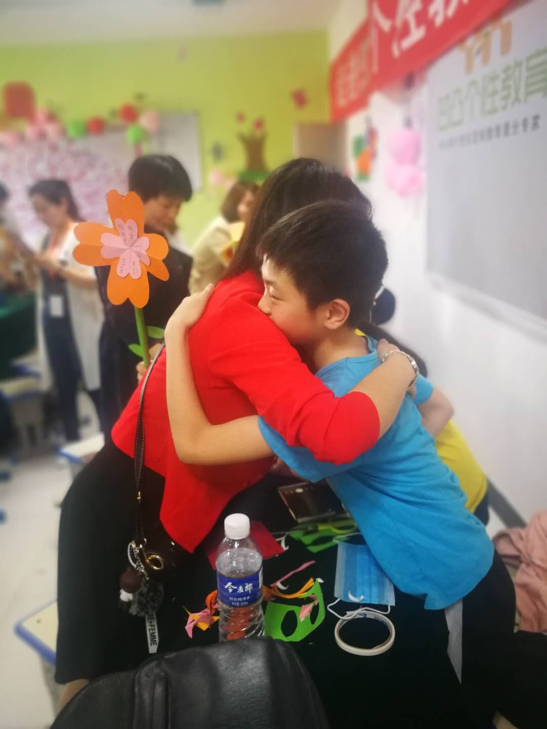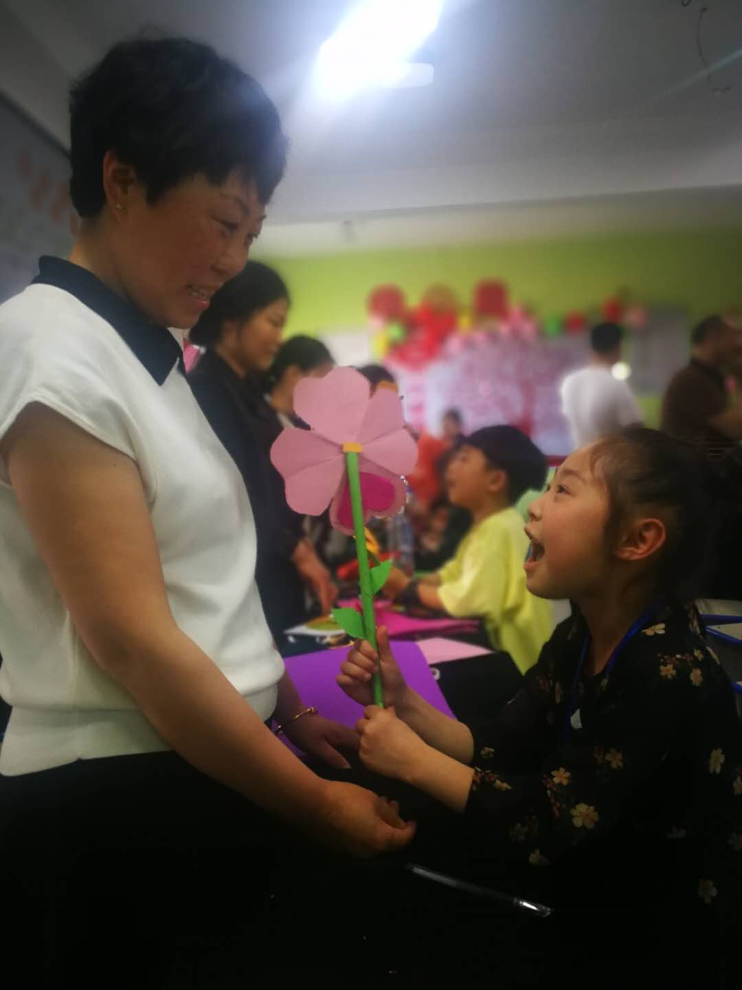 活動上,在專業(yè)手工教師的指導以及媽媽的配合下,這些小記者自己動手利用剪刀、雙面膠、彩紙等學習制做康乃馨紙花。五層紅色的花瓣、兩片綠葉、一根花枝,經(jīng)過近一個小時的反復實踐,一朵朵紙花陸續(xù)制好,成功的喜悅映紅了孩子們的笑臉。在祝福卡片上寫下對媽媽的祝福語后,孩子們手捧用彩紙包裝好的紙花,拿著祝??ㄋ偷侥赣H手中,和媽媽熱情擁抱、向媽媽表達愛的祝福。
