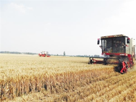 5月28日,沈丘縣周營鎮(zhèn)歐營行政村的麥田里,兩臺(tái)大型收割機(jī)正在緊張工作。眼下,該縣102萬畝小麥已陸續(xù)成熟,當(dāng)?shù)剞r(nóng)民緊抓有利天氣條件搶收小麥。謝辛凌 攝