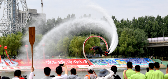 水上飛行器表演是觀賞性較高的水上表演之一,俗稱水上“鋼鐵俠”,是一項(xiàng)由外國(guó)人發(fā)明的水上摩托表演項(xiàng)目,兩人一組,一人駕駛摩托艇,一人在水面表演。飛行器的動(dòng)力主要來自于摩托艇,靠一根水管連接在摩托艇的噴射口,通過摩托艇的噴射動(dòng)力把人沖起來,最高能達(dá)到10米。表演者要在空中完成各種花樣動(dòng)作,這對(duì)表演者的平衡及身體協(xié)調(diào)能力要求很高。