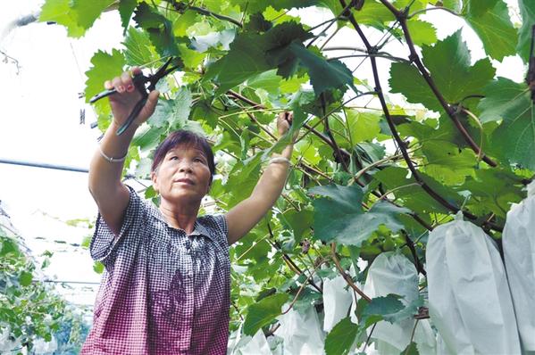 8月3日,一村婦在河南省商水縣天力葡萄種植農民專業(yè)合作社為葡萄剪枝打杈。