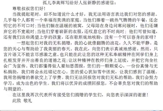 為表示對張新靜等人大代表的感謝,隨后,李高輝給張新靜寫了一封感謝信。信中,他表示,自己一定不辜負(fù)大家的期望,以后會更加努力學(xué)習(xí),回饋社會,回報大家?!八且粋€懂得感恩的孩子,讀了他的來信,我感到很欣慰?!睆埿蚂o說。