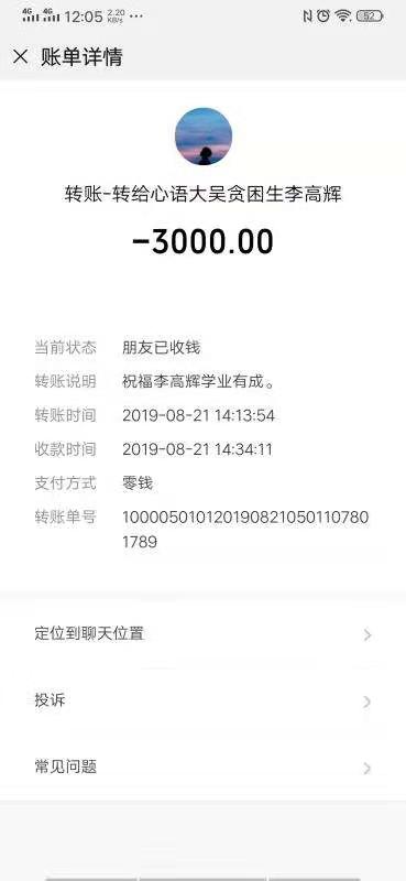“今后,在學(xué)習(xí)和生活上無論遇到什么困難,只管給我們說,我們會隨時幫助你解決?!睆埿蚂o在與李高輝聊天中再三叮囑李高輝說。隨后,他通過微信給李高輝轉(zhuǎn)來3000元學(xué)費(fèi)。