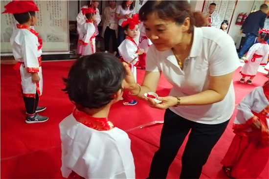 活動包含“朱砂開智”、誦讀《弟子規(guī)》、“擊鼓明志”、書畫展示、感恩五個環(huán)節(jié):第一個環(huán)節(jié)老師為孩子“朱砂開智”。用朱砂為剛剛?cè)雽W(xué)的孩子在額頭正中點上紅痣,又稱之為“開天眼”。寓意著孩子從此心明眼亮,好讀書、讀好書。第二個環(huán)節(jié)老師帶領(lǐng)大家誦讀《弟子規(guī)》。孩子們在老師及社區(qū)工作人員帶領(lǐng)下誦讀國學(xué)經(jīng)典《弟子規(guī)》,一起感受儒家經(jīng)典的道德教化魅力。第三個環(huán)節(jié)是“擊鼓明志”。擊鼓明志是結(jié)合中國傳統(tǒng)文化,讓孩子們通過擊打中國鼓,以鼓聲的清脆悅耳,來提高孩子的精氣神,激發(fā)孩子們的斗志,給孩子們建立濟世救人,胸懷天下的抱負,從而也讓孩子們表達出人生理想,為未來的人生目標(biāo)努力奮斗。“我長大想當(dāng)一名醫(yī)生,可以治病救人……我長大想當(dāng)一名消防員,在著火的時候奔赴火場救人……我長大想當(dāng)一名古箏老師,登上世界舞臺彈奏好聽的音樂……”孩子們依次擊鼓并說出了人生理想抱負。第四個環(huán)節(jié)是書畫展示。繪畫創(chuàng)作讓孩子們靜定心靈,激發(fā)智慧。第五個環(huán)節(jié)是感恩環(huán)節(jié),感恩老師、感恩父母、感恩天地萬物,以此培養(yǎng)孩子們向善向上的健康思想,增強他們的社會責(zé)任感,進一步引導(dǎo)他們常懷感恩之心。