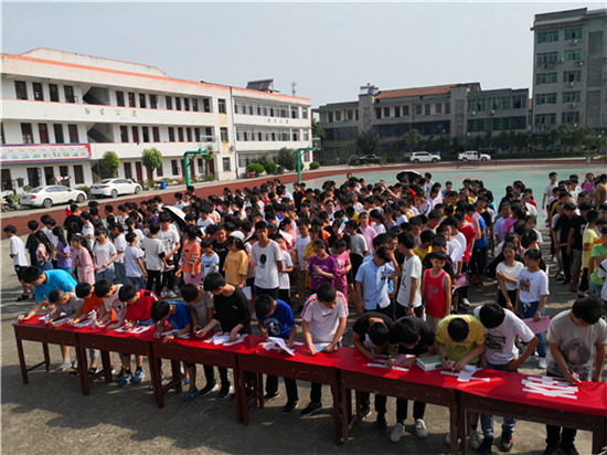 7月2日,沼山中學(xué)師生齊聚學(xué)校操場,舉行“小手拉大手 同創(chuàng)文明城”活動啟動儀式。活動現(xiàn)場,同學(xué)們整齊列隊,依次上前,鄭重地在橫幅上簽上自己的名字,吹響學(xué)校新一輪創(chuàng)建攻堅號角。